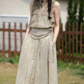Atacado Mulheres Moda Casual Linho Algodão Maxi Saias Cintura Elástica com Botão Decoração Plissada Summer Beach Saias